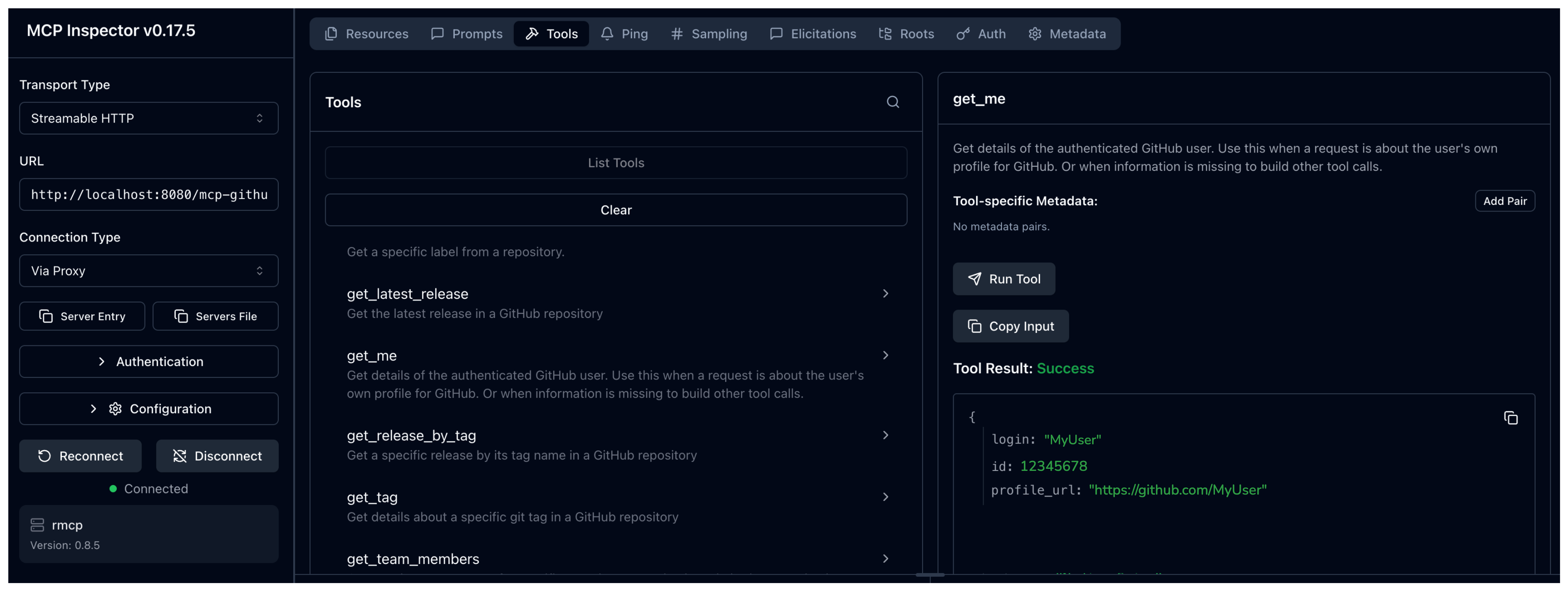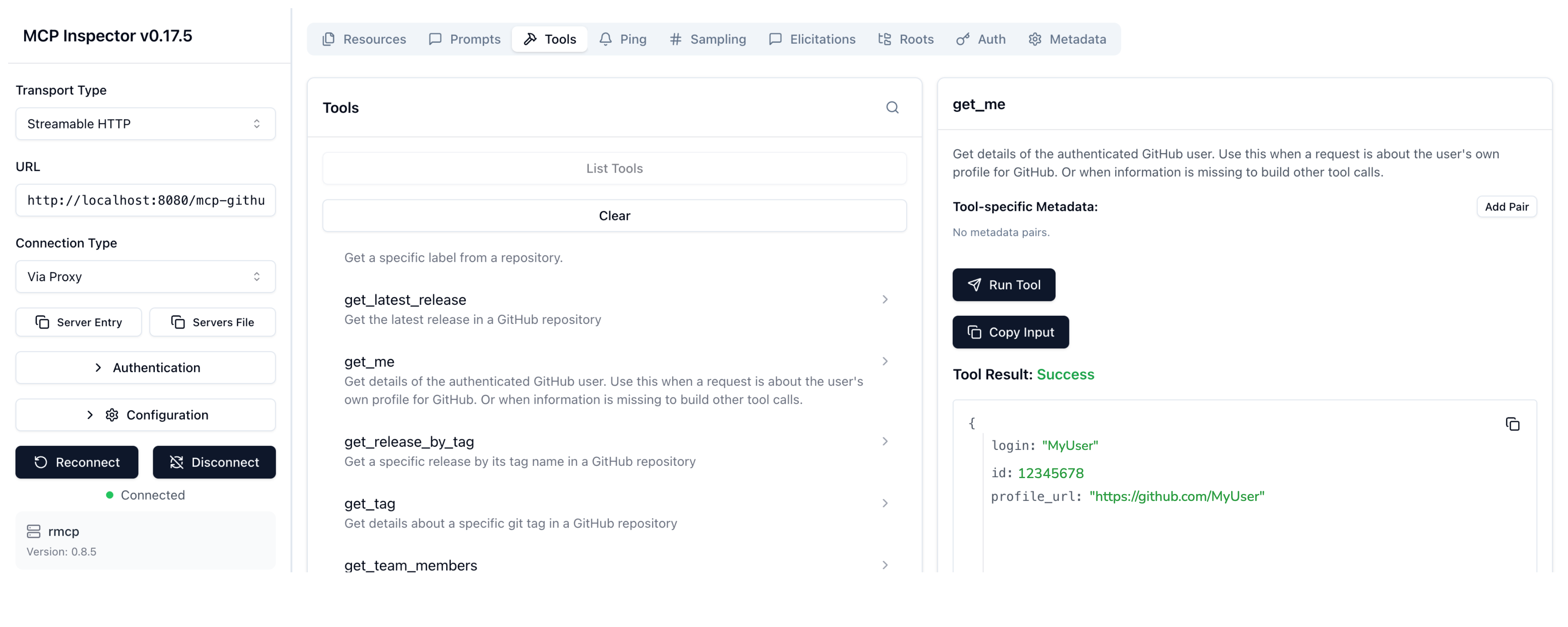 /mcp-githubpath. If your agentgateway proxy is exposed with a LoadBalancer server, usehttp://<lb-address>/mcp-github. In local test setups where you port-forwarded the agentgateway proxy on your local machine, usehttp://localhost:8080/mcp-github. - Click Connect.