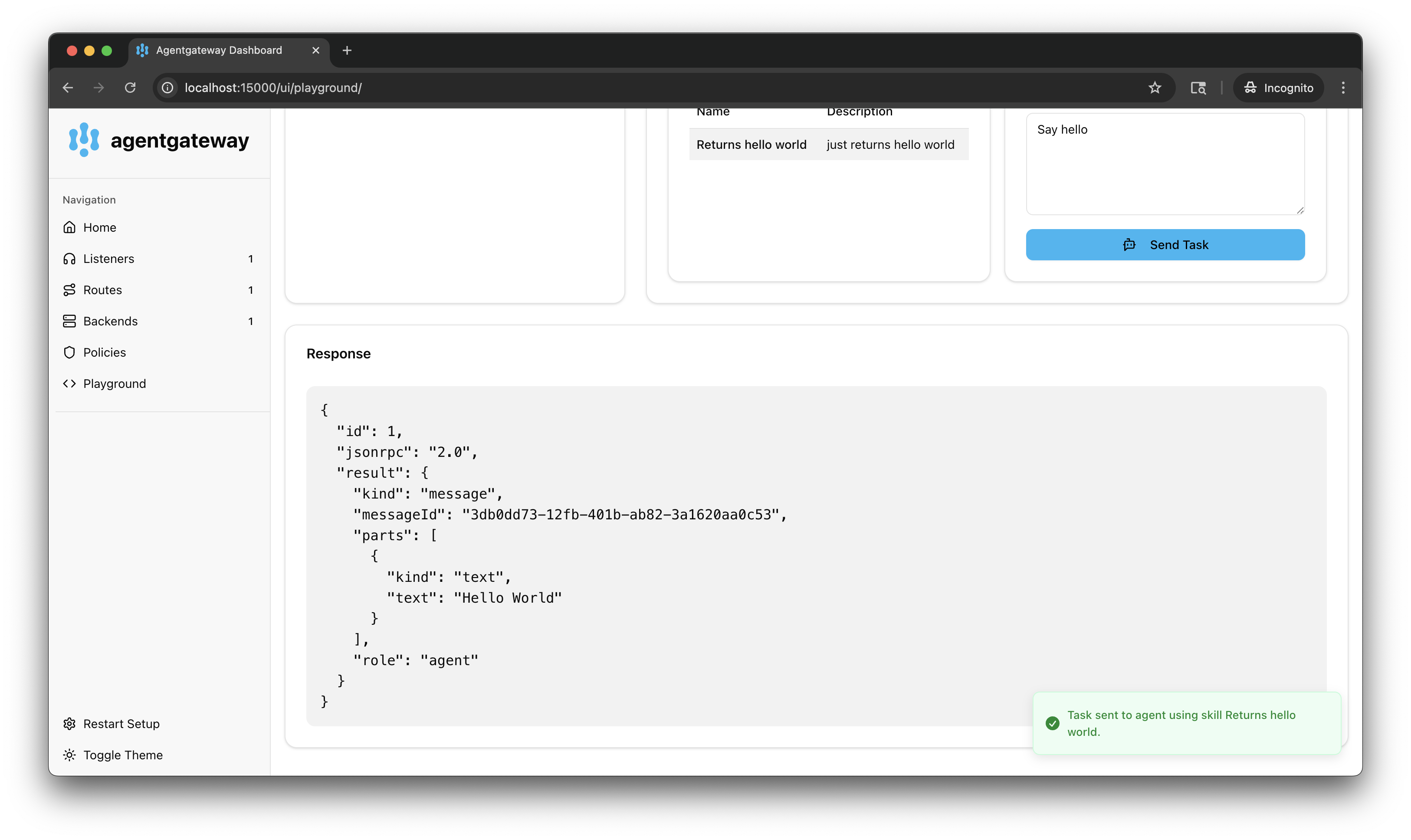 Say hello, and click Send Task.Verify that you get back a message from the ADK agent stating that your request was processed successfully.